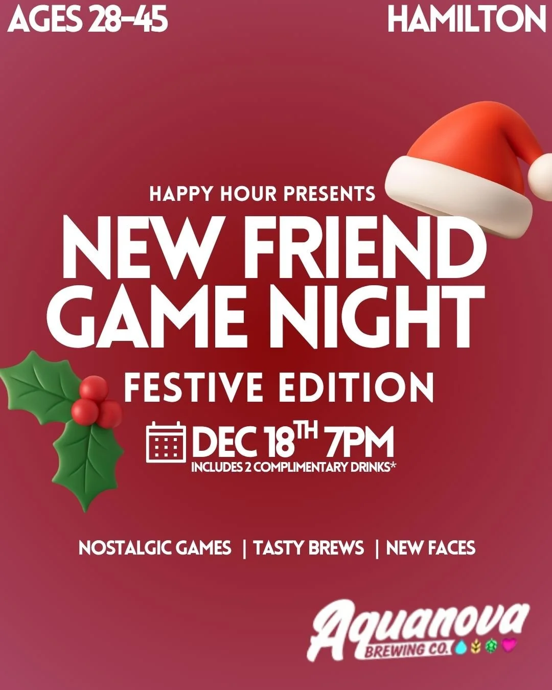 Happy Hour presents by popular demand a Festive New Friend Game Night at AquaNova Brewing Co.